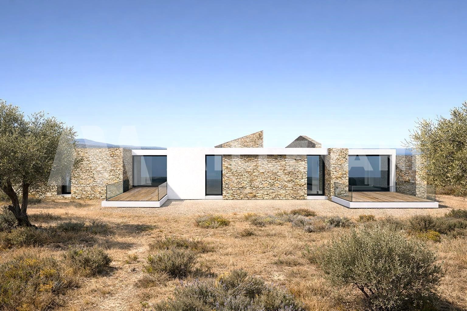 The estate sits on a plot of around 5,000 sqm, largely enclosed by traditional dry-stone walls—distinctive features of the local landscape. The generous outdoor spaces, beautifully integrated into the natural surroundings, provide the perfect setting for a lush Mediterranean garden or a striking infinity pool with sea views, creating a private oasis of peace and relaxation.