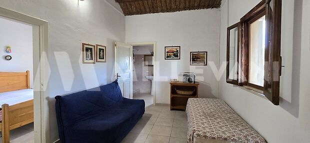 The property is arranged on a single level and offers a well-designed internal layout. The entrance opens directly onto a bright living area with an open-plan kitchen, enhanced by high ceilings with exposed wooden beams that create a pleasant sense of space and character. The sleeping area includes a spacious double bedroom and a hallway, both featuring traditional cane-and-plaster ceilings, a distinctive element of local architecture. A bathroom completes the interior accommodation.