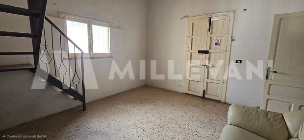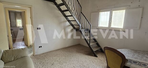 The property is laid out on a single level and features a welcoming open-plan kitchen and entrance area, a hallway leading to the bathroom and a first bedroom. The layout is completed by a spacious master bedroom and a bright living room, enhanced by an internal staircase that leads to a practical mezzanine—ideal as a versatile additional space.