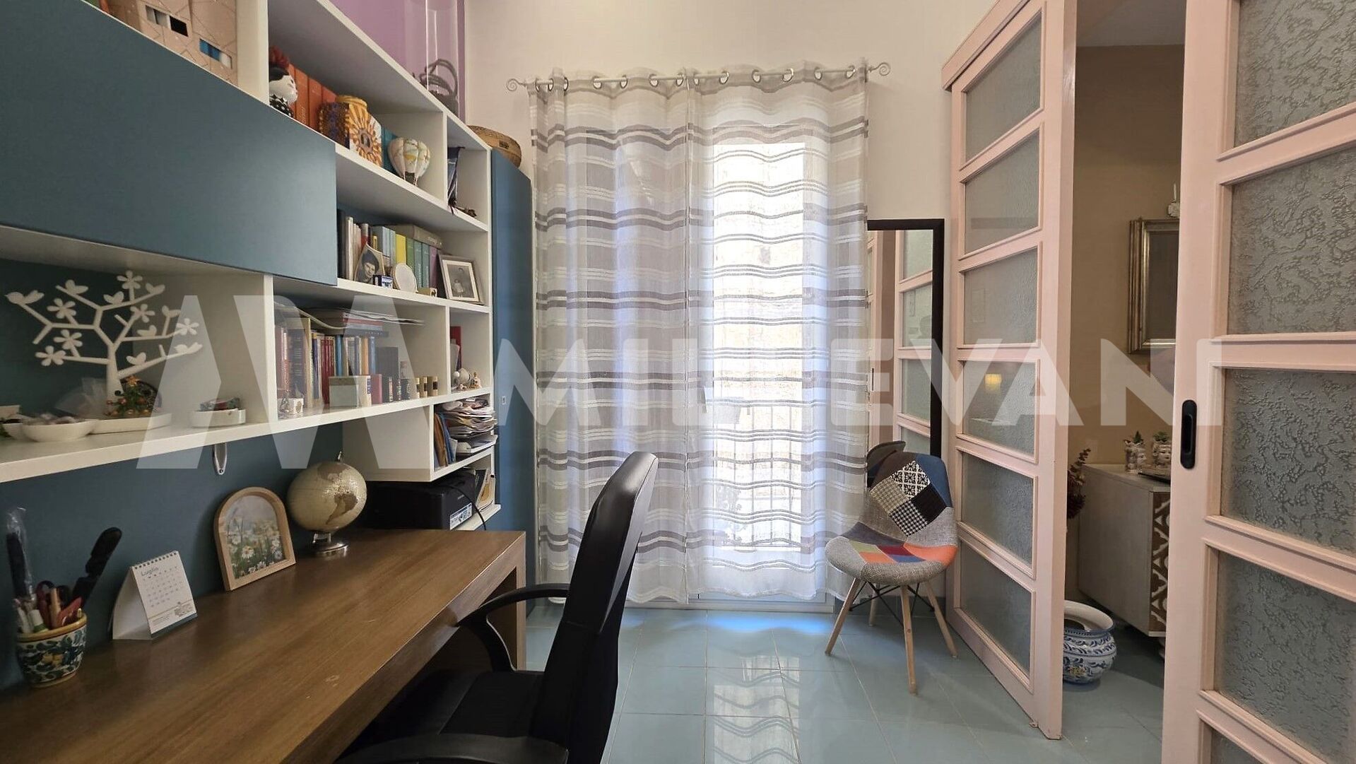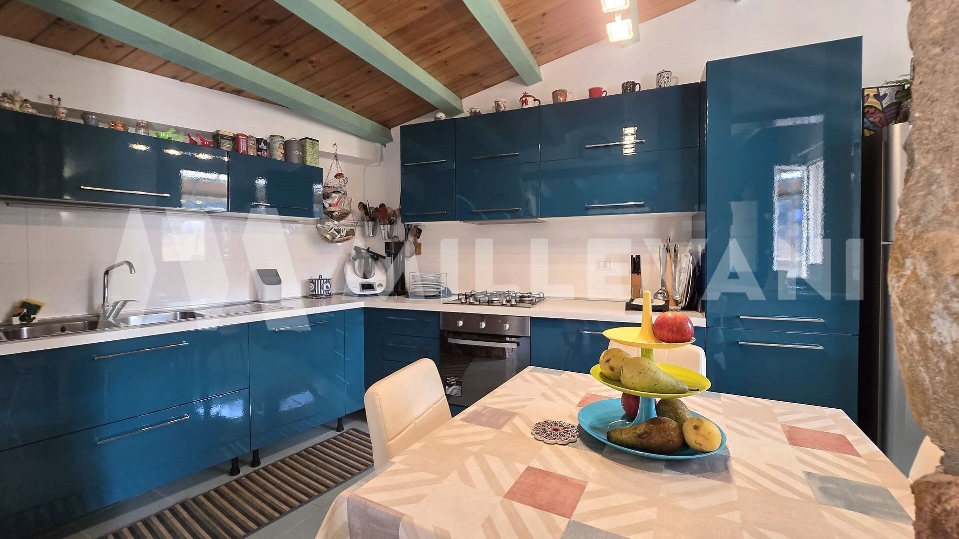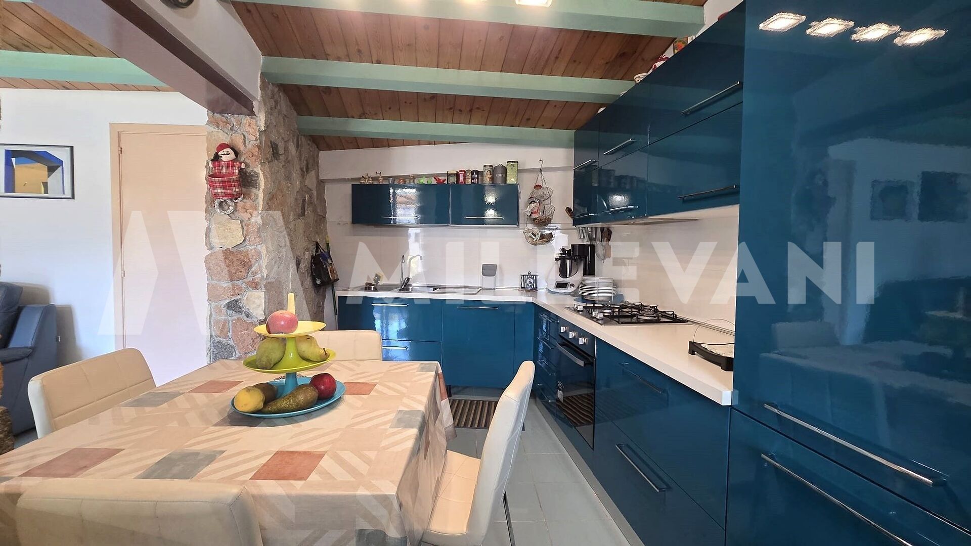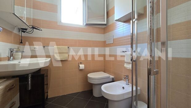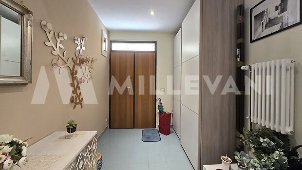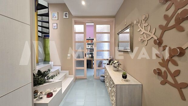 A spiral staircase leads to the second floor, where we find a living area with kitchen, a laundry room, and a terrace of approximately 15 square meters with a panoramic view.