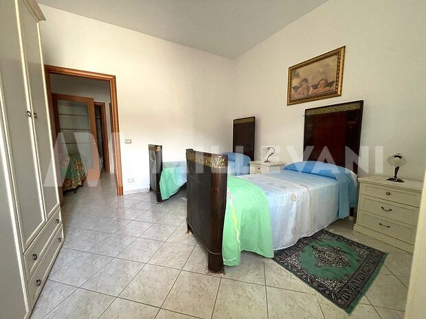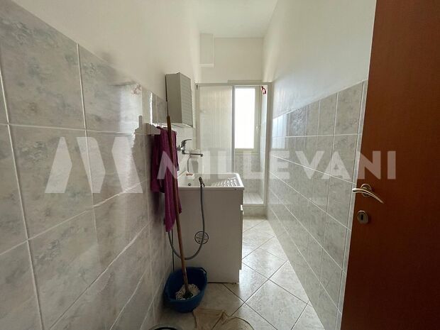 The sleeping area, thoughtfully set apart, includes two comfortable bedrooms, two bathrooms, and a practical storage room. The property is further enhanced by a lovely veranda with a sea view, perfect for relaxing outdoor moments, which is directly connected to a large garage of approximately 40 sqm, ensuring both convenience and additional space.