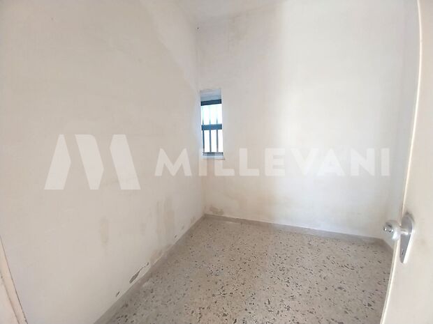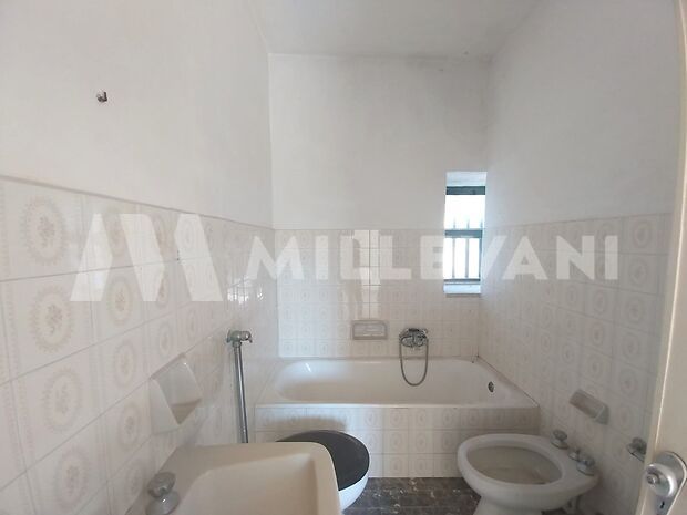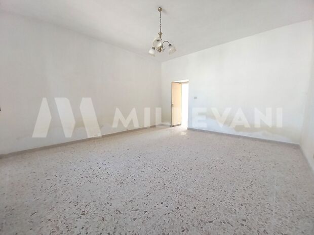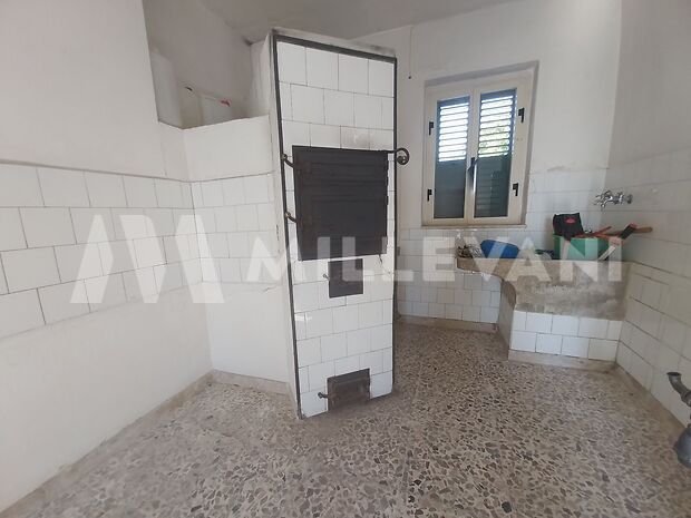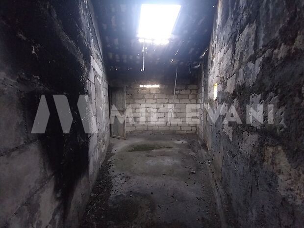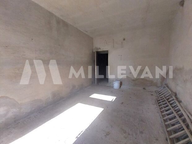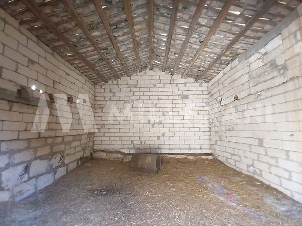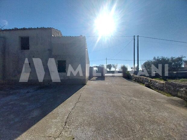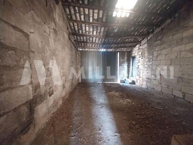 The property is divided into two parts. The main part, measuring approximately 115 m2, houses the living area, comprising an entrance hall, living room, kitchen with a stone oven, a double bedroom, and a bathroom.