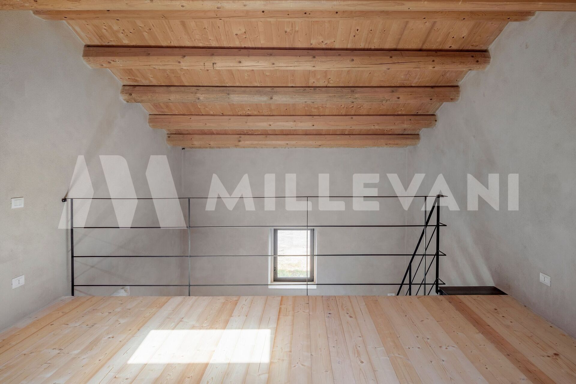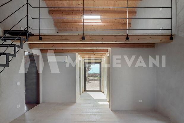 L’abitazione principale si apre dopo un ingresso principale con una cucina a doppia altezza con studio su soppalco, seguita da un ampio salone centrale con travi a vista e volumi ariosi.