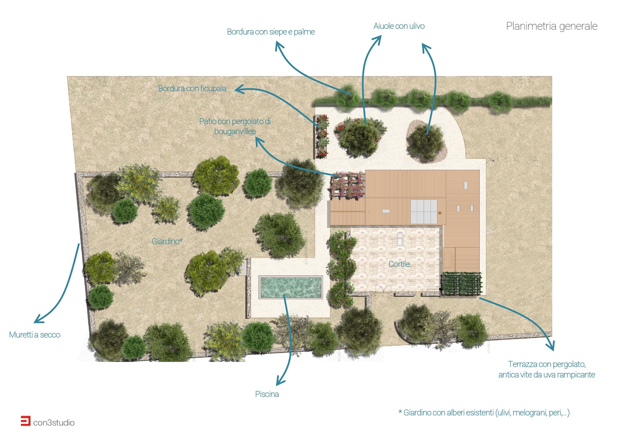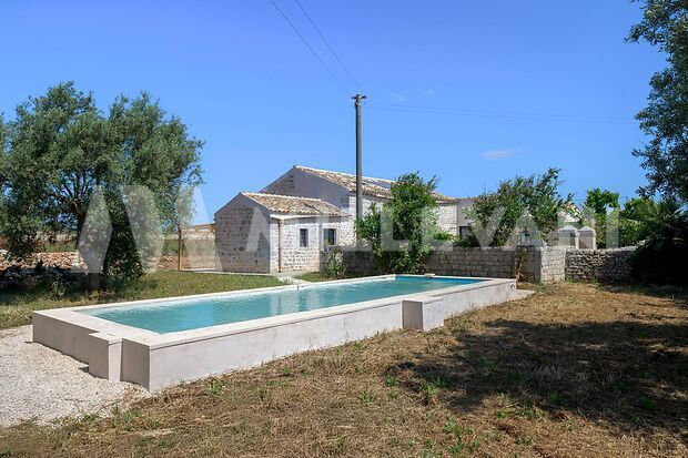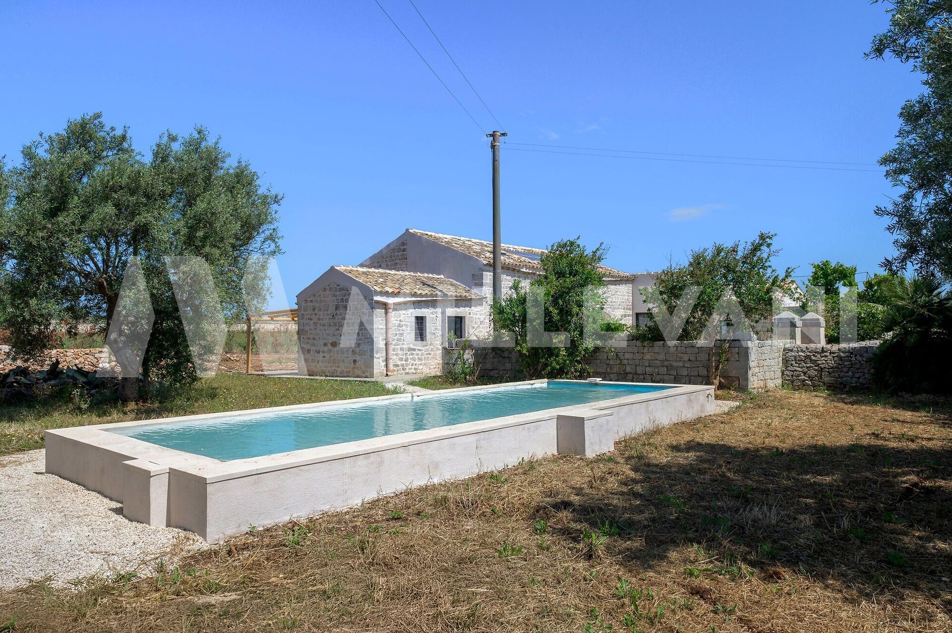 All’esterno, un terreno pianeggiante di *4.000 mq ospita un giardino mediterraneo con alberi da frutto, una piscina di ispirazione tradizionale rivestita in pietra di Modica, una veranda di 20 mq collegata alla cucina, un terrazzo panoramico con vista mare e un ampio parcheggio.