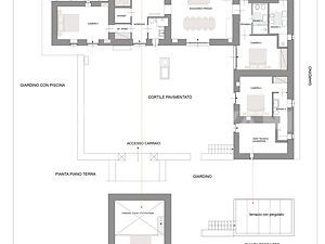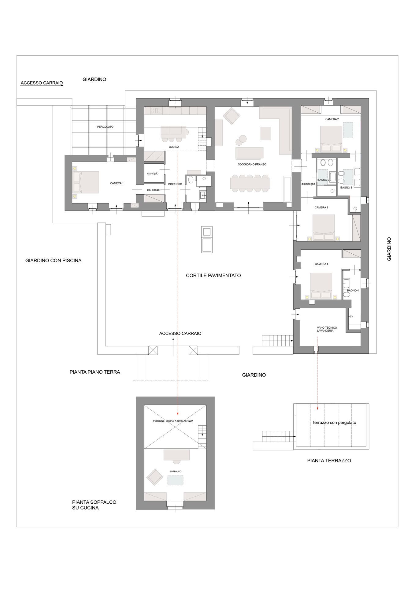 La zona notte si articola in 4 camere matrimoniali e 4 bagni, di cui due ensuite, distribuite tra corpo principale e dependance indipendente, ideale per ospiti o famiglia., una lavanderia, cabine armadio e spazi di servizio completano gli interni.