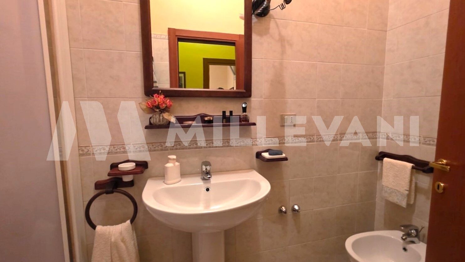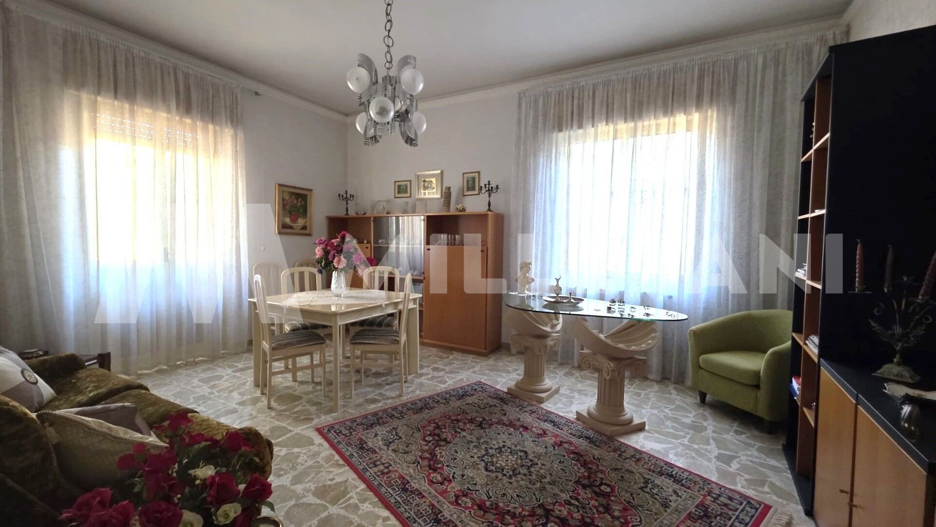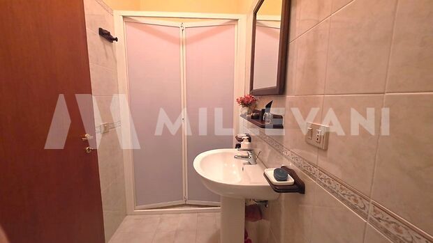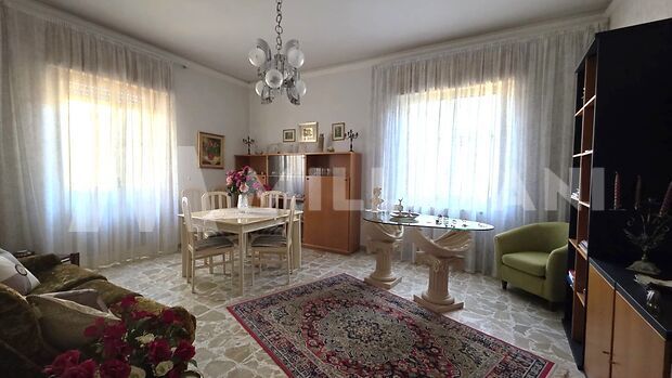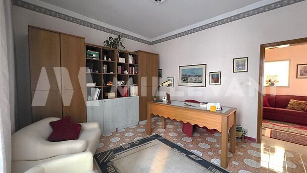 L’altro appartamento, al primo piano, di circa 120 mq, ampio e luminoso, è composto da ingresso, ampio salone, cucina, uno studio, una camera singola, una camera matrimoniale e bagno.