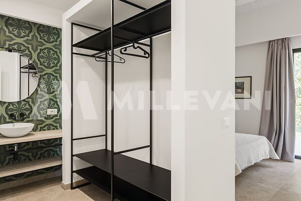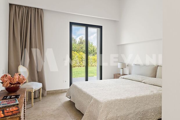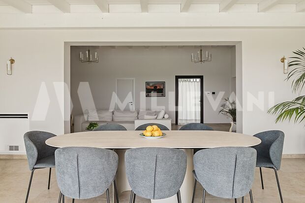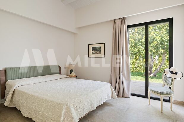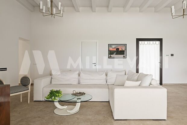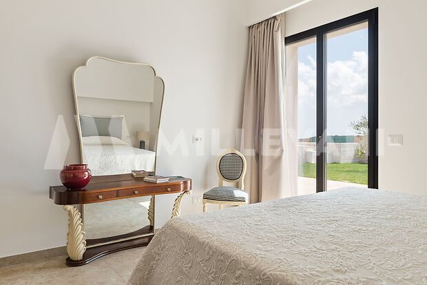 L’immobile, si sviluppa al piano terra con una luminosa zona living composta da soggiorno e sala da pranzo con affaccio diretto sulla piscina, una cucina moderna completa di piano a induzione, cappa aspirante ed elettrodomestici di ultima generazione, oltre a quattro spaziose camere matrimoniali, ciascuna con cabina armadio e bagno en suite, pensate per garantire il massimo della privacy e del comfort.