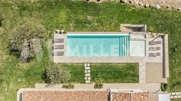 All’esterno, una splendida piscina con zona solarium crea un ambiente esclusivo, perfetto per vivere appieno la bellezza del contesto.