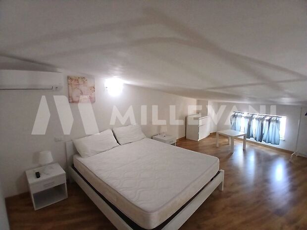 Una moderna scala in ferro battuto e legno ci conduce alla zona soppalcata, dove attualmente si trova la camera da letto matrimoniale.