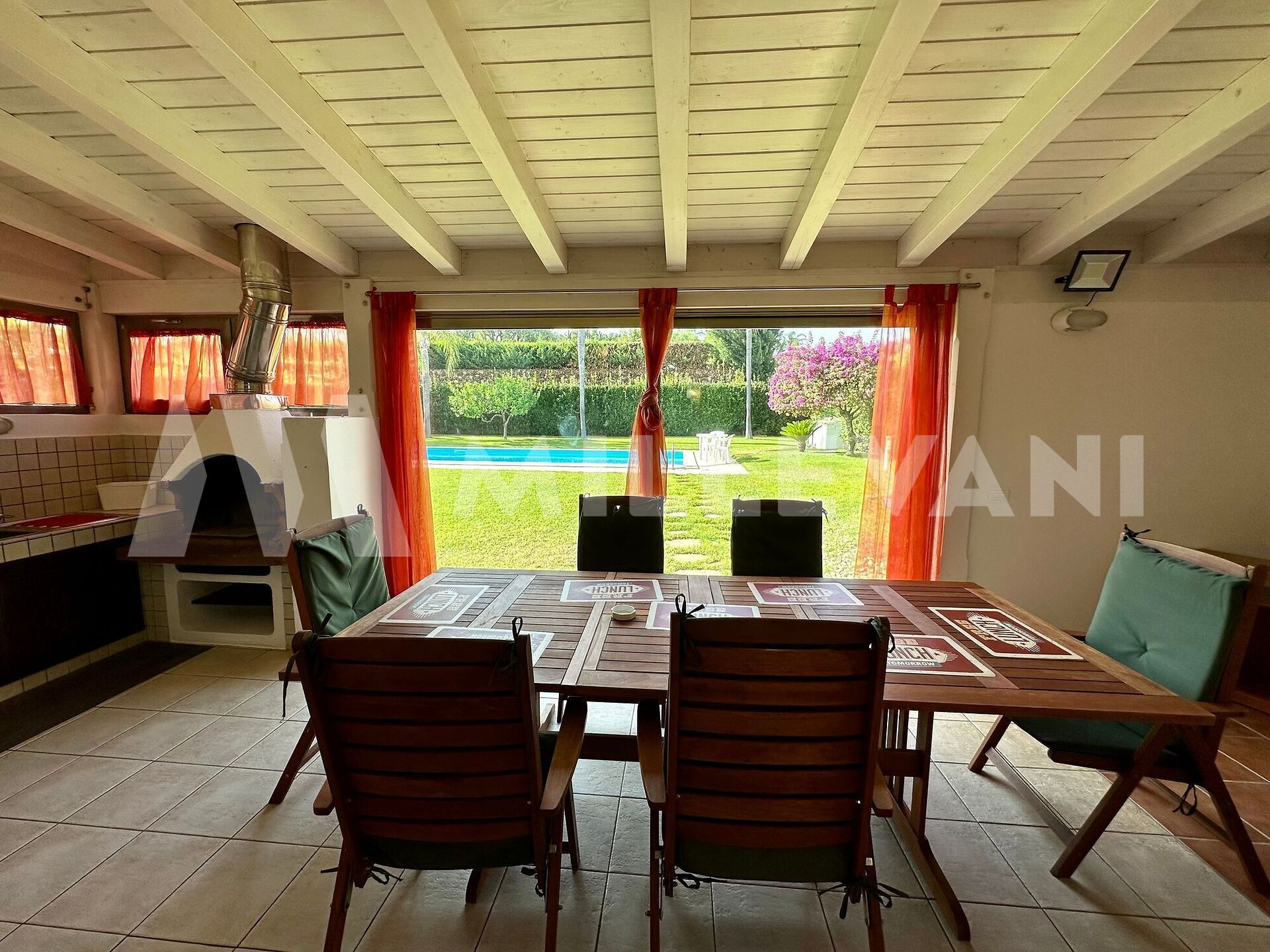 Nella zona esterna troviamo un vano lavanderia con bagno, 2 docce adiacenti la piscina ed una tettoia per 2 posti auto.