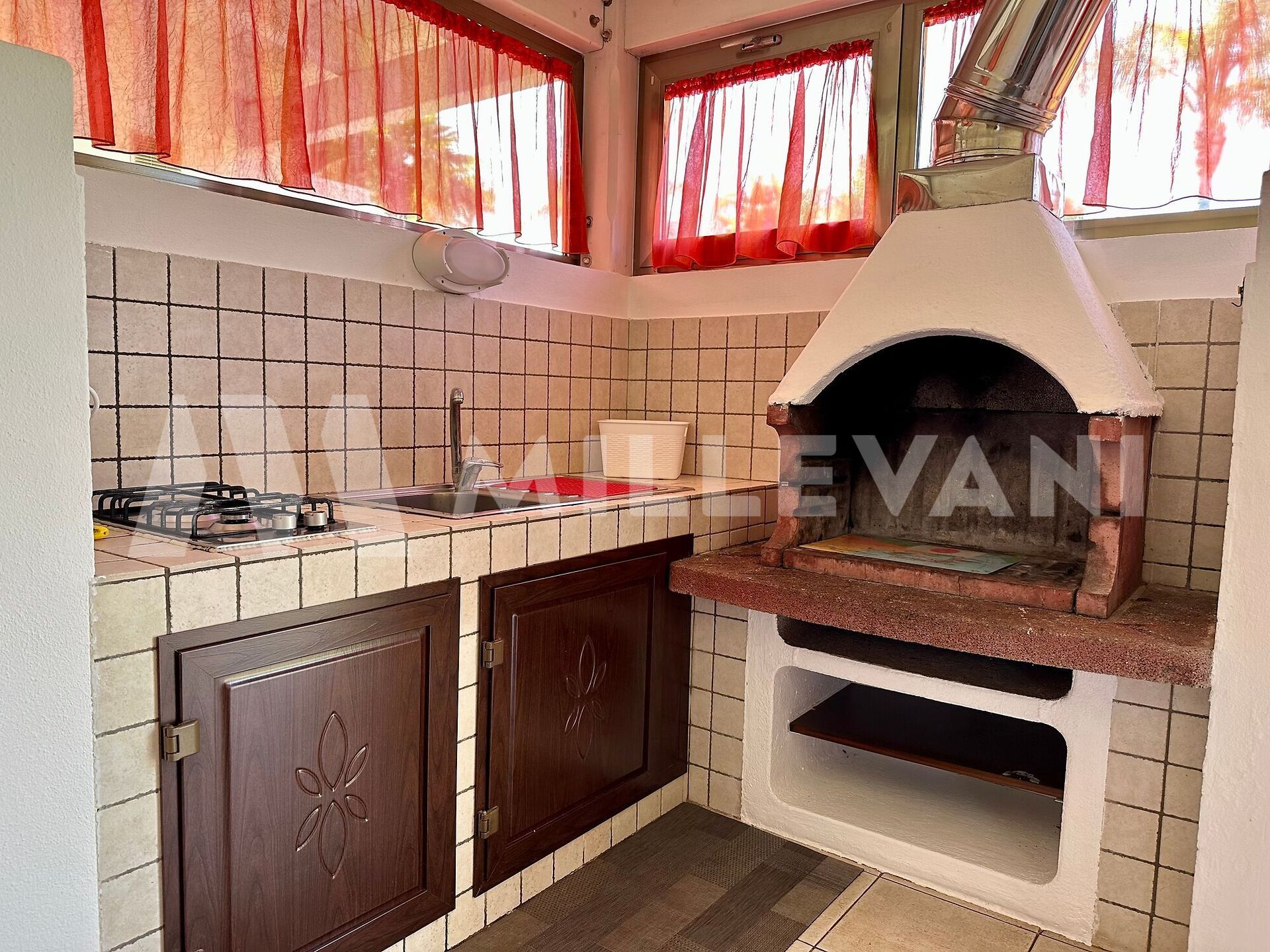 L’immobile si sviluppa su un unico piano ed è composto da ingresso-soggiorno, cucina, una camera matrimoniale, due camere doppie e due bagni. Dalla cucina si accede alla veranda coperta attrezzata con angolo cottura, barbecue e zona relax.