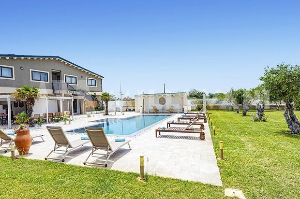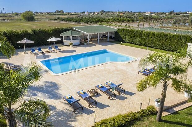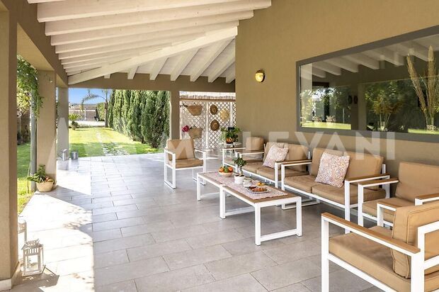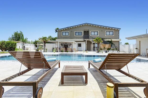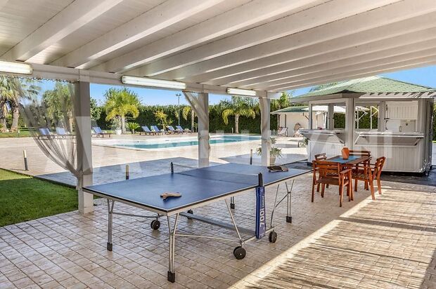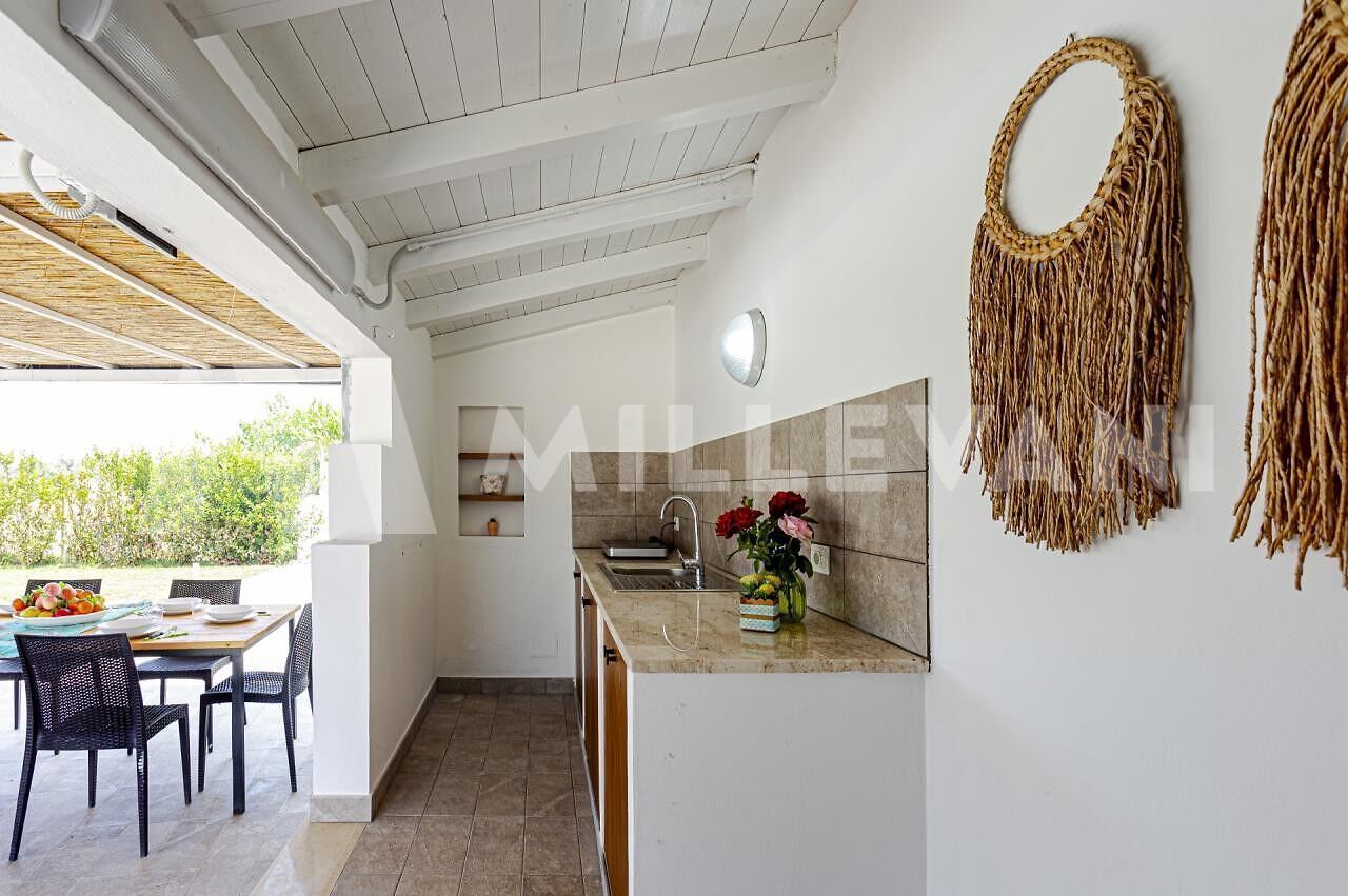 La seconda villa, di circa 300 mq, offre ampi spazi interni climatizzati, cinque camere con bagno en suite, cucina attrezzata, cucina esterna con BBQ, piscina, terrazza solarium, area svago, giardino paesaggistico e parcheggio privato recintato.