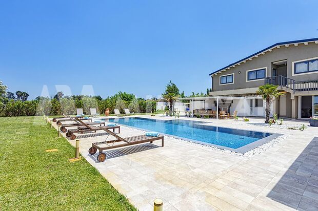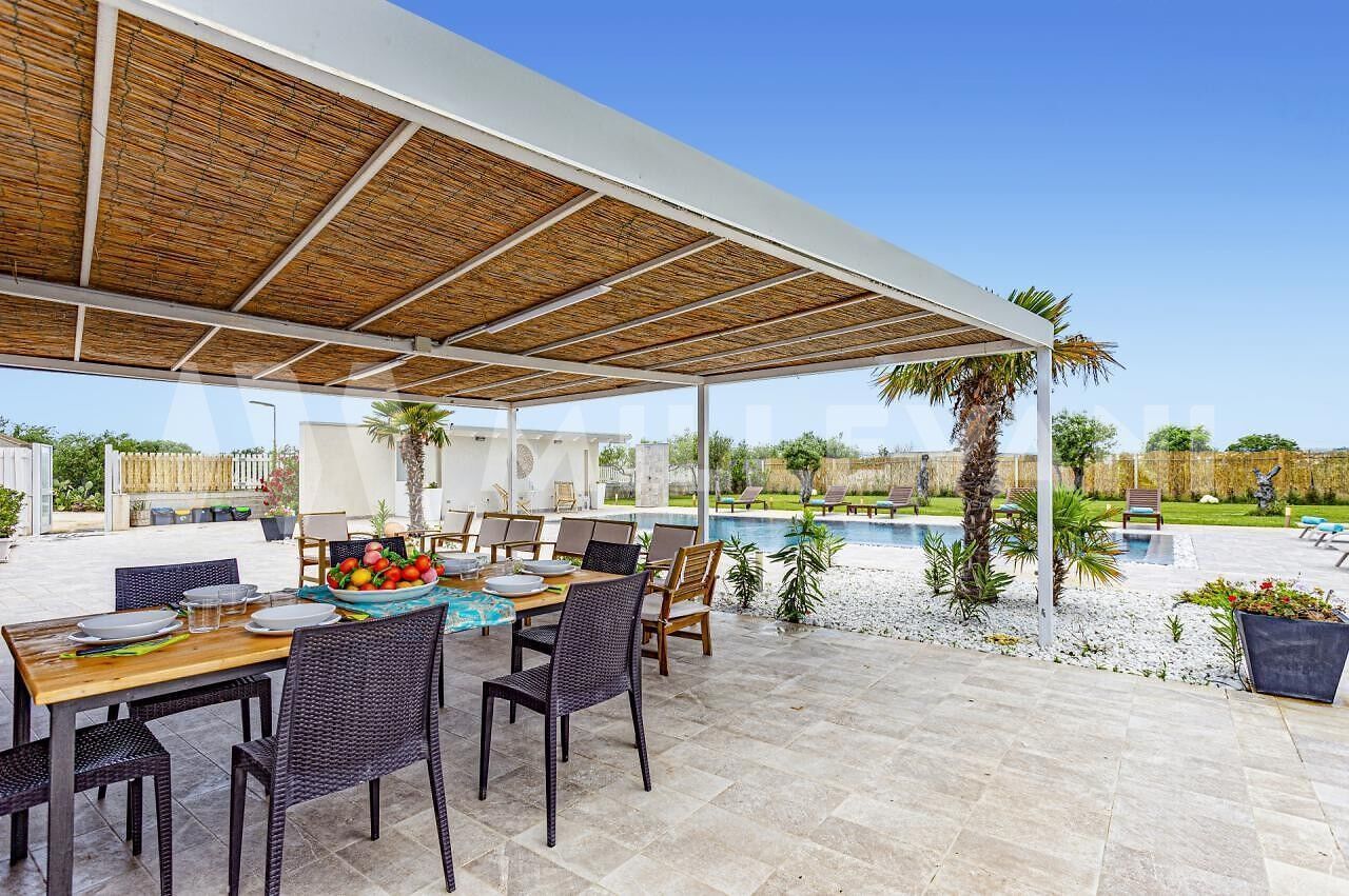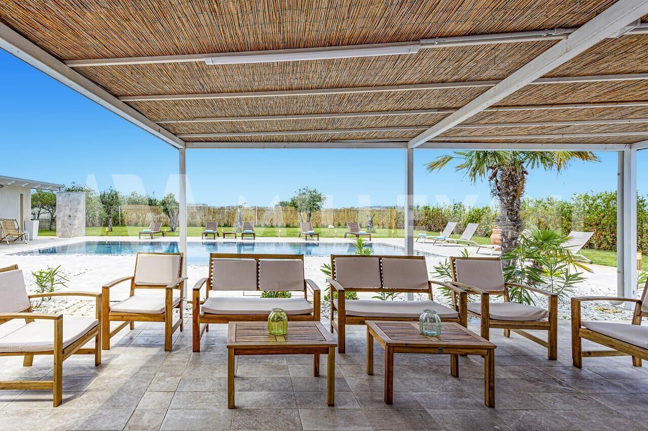 La prima villa, di circa 200 mq, presenta ambienti moderni e luminosi, zona living con cucina, cinque camere da letto tutte con bagno en suite, piscina privata, area solarium e giardino.